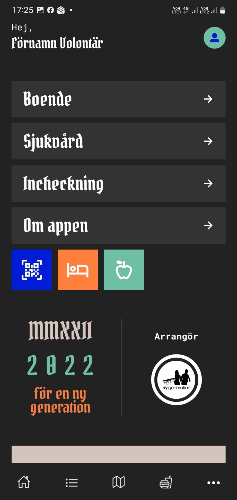 Mitt konto - Info om sovplats, samt QR-kod för volontärer att skanna.