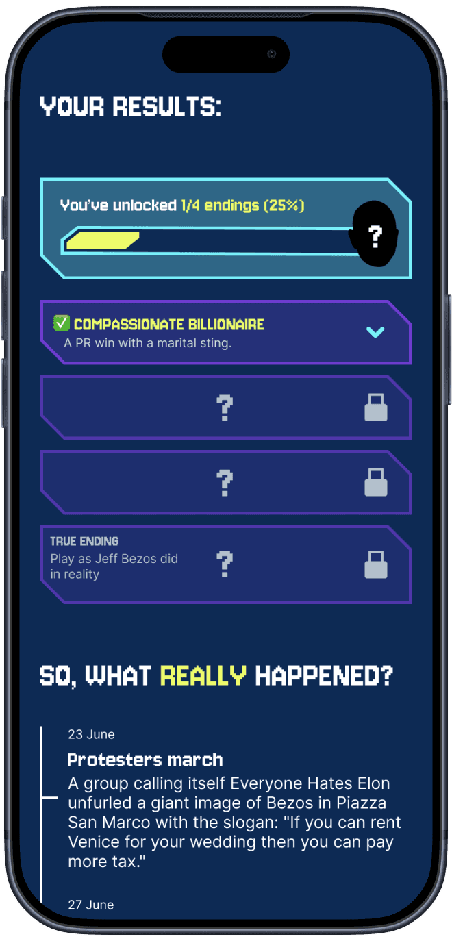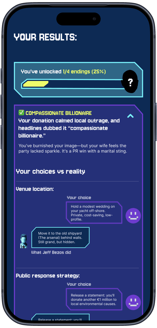 Spelaren kan jämföra sina val med verkligheten och låsa upp andra slut genom att spela igen. Låser man upp alla vinner man ett pris!