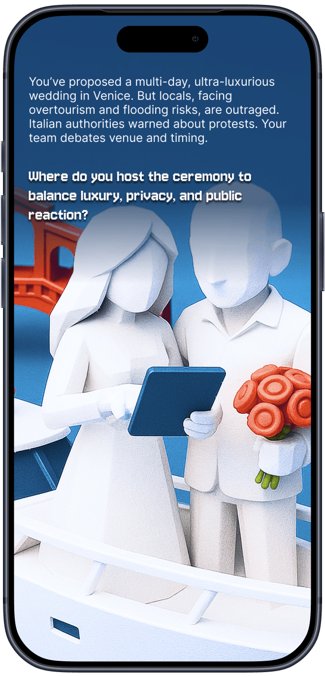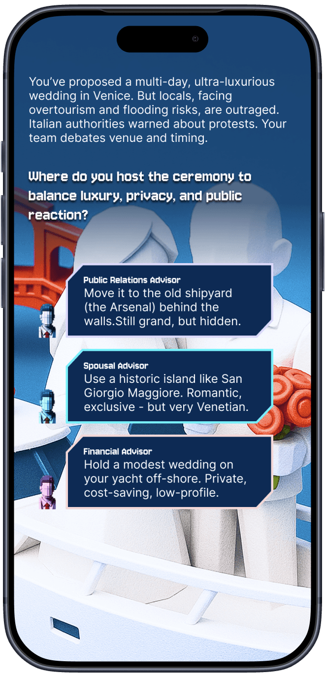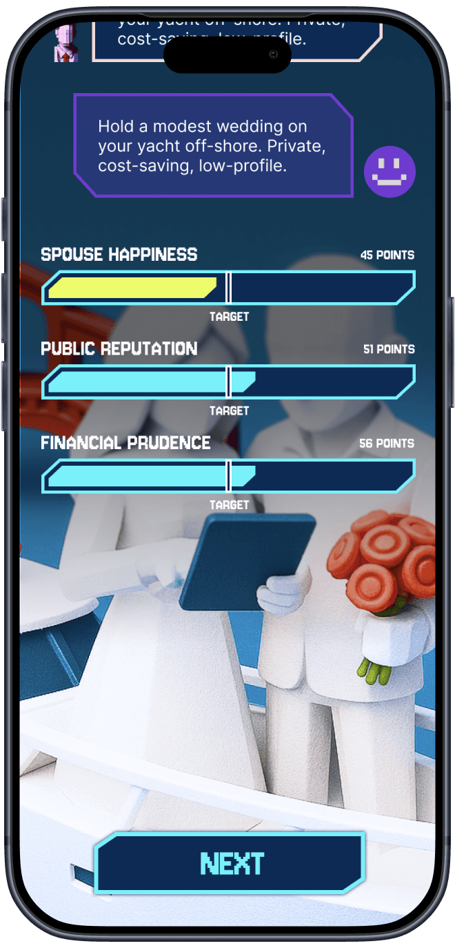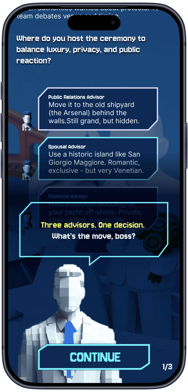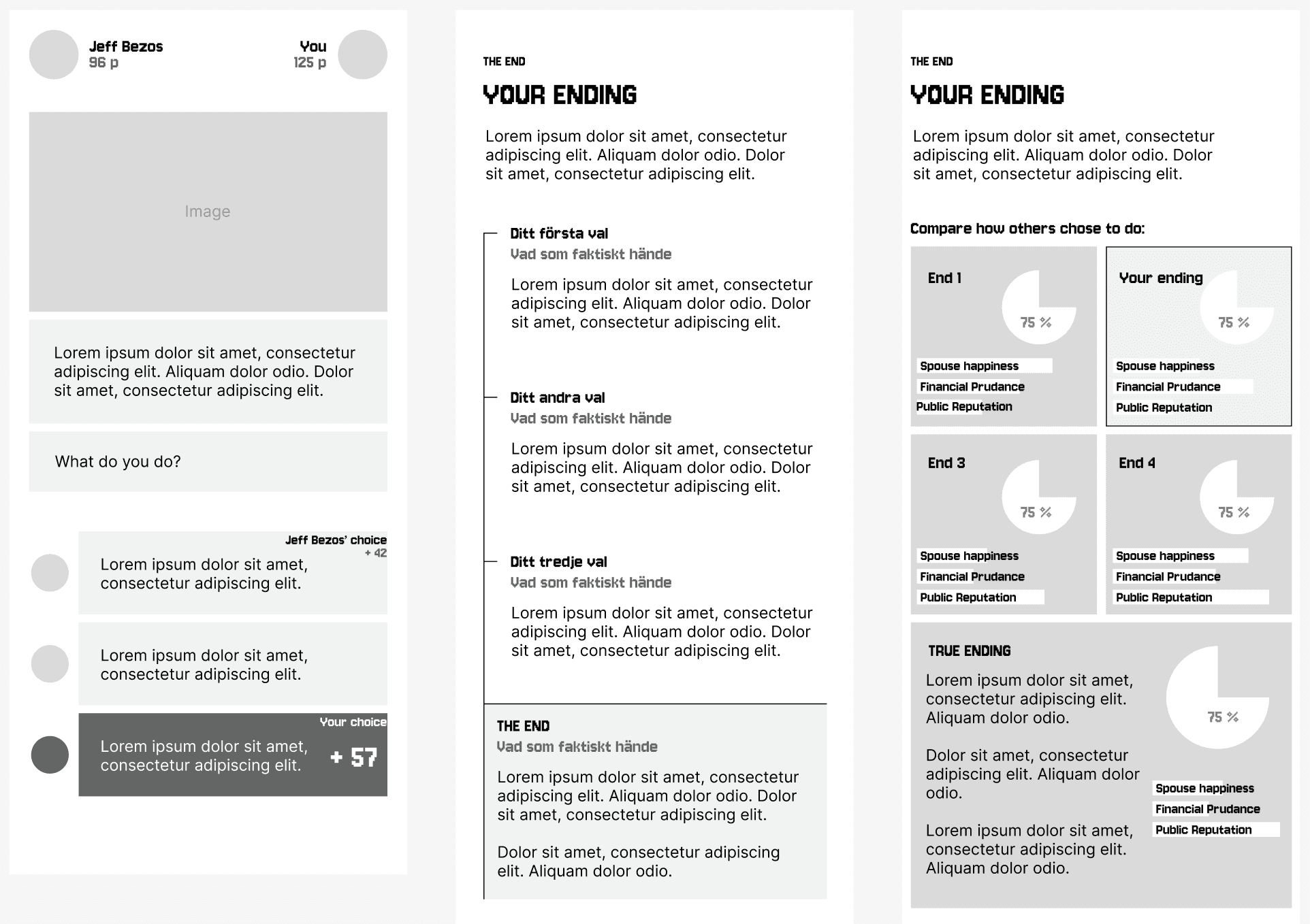 Efter flera rundor av SITUATION → FRÅGESTÄLLNING → BESLUT → POÄNG får spelaren ett slut baserat på de val som hon gjort.